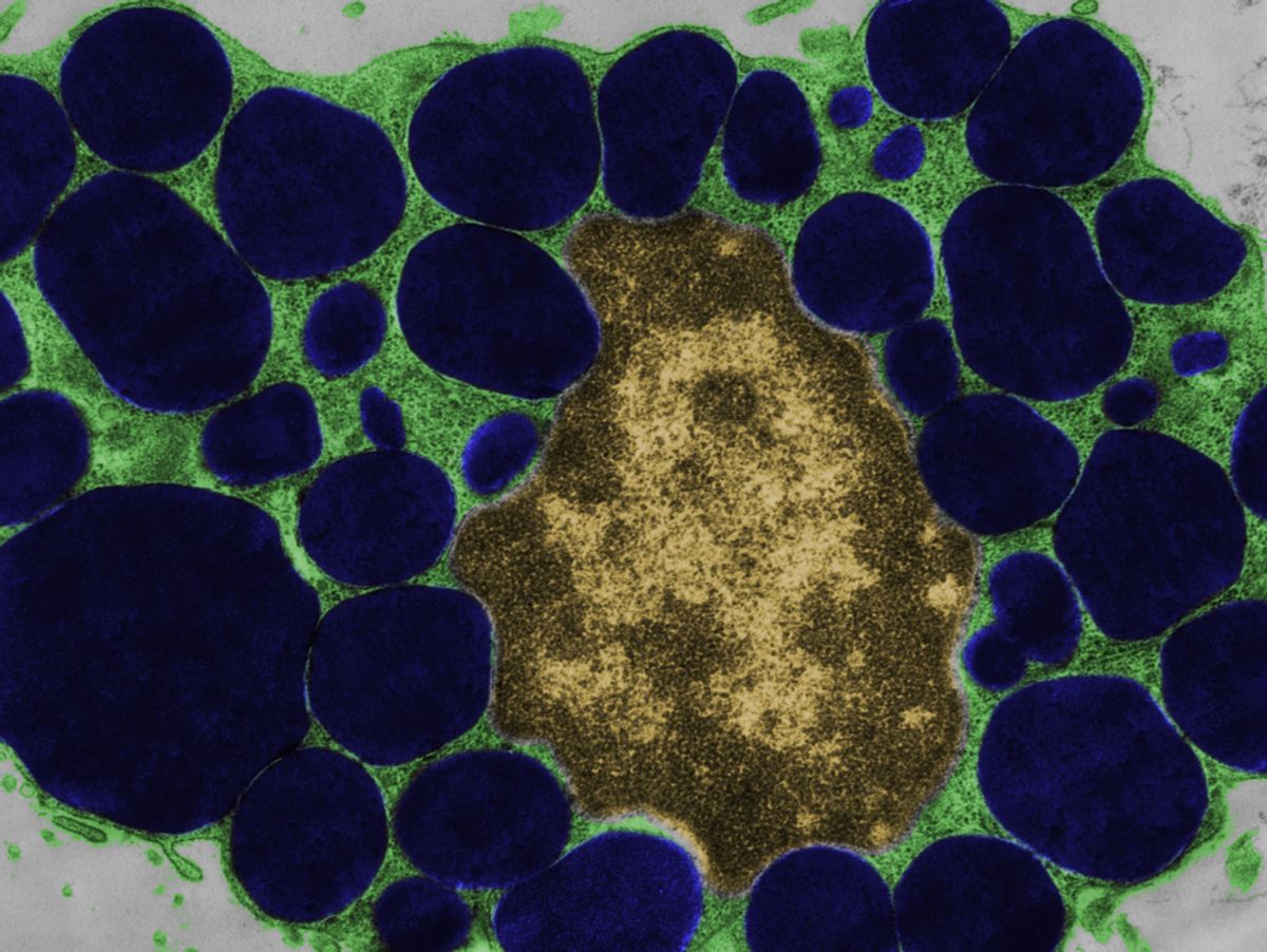 Bild 3: Mastzelle: Zytoplasma (grün), histaminhaltige Vesikel (blau), Zellkern (braun). Das Foto wurde mit einem Transmissionselektronenmikroskop aufgenommen, die Farben wurden später hinzugefügt.
