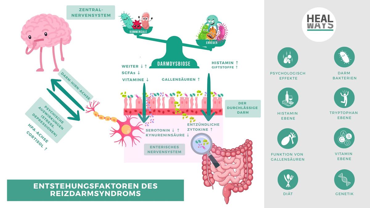 Die Pathogenese und Pathophysiologie von IBS sind noch nicht vollständig geklärt. Es handelt sich um einen multifaktoriellen Prozess, an dem mehrere Faktoren beteiligt sind, wie z. B. eine gestörte Kommunikation entlang der Darm-Hirn-Achse, Immunschwäche, Veränderungen der Darmflora, Nahrungsmittelunverträglichkeiten und genetische Veranlagung. Es ist noch unklar, welche dieser Faktoren bei bestimmten Personen die Entstehung von IBS auslösen und welche die Symptome verschlimmern. [15]