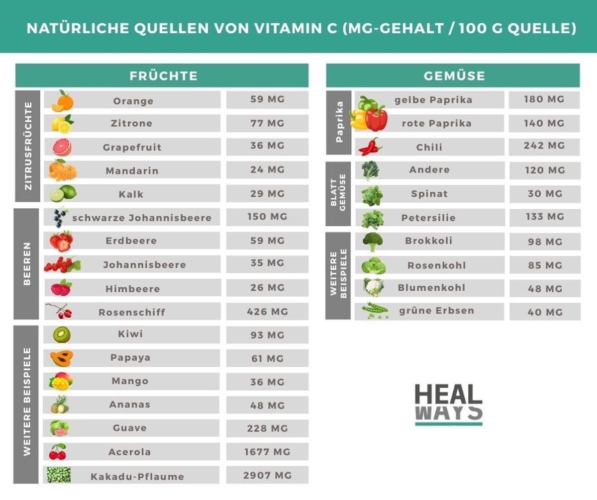 - Beeren: Johannisbeeren (150 mg), Erdbeeren (59 mg), Stachelbeeren (35 mg), Himbeeren (26 mg), Hagebutten (426 mg). Barbados-Kirschen gehören zu den reichhaltigsten natürlichen Quellen (1677 mg) [2].
